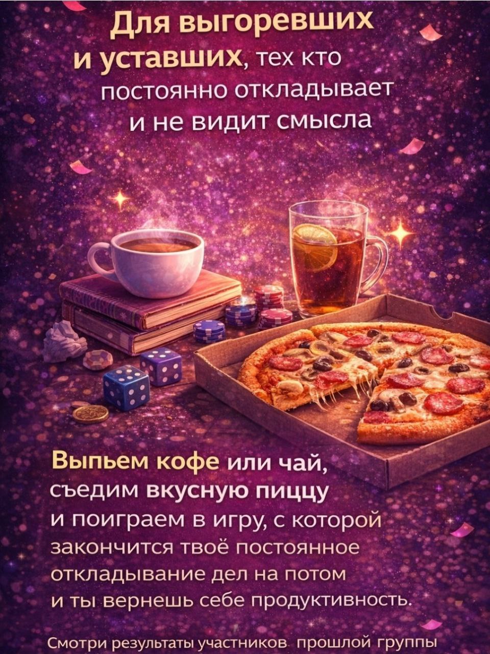 Поиграем за вкусным чаем, кофе или какао с пицца, и научимся быть продуктивными без насилия над собой и жесткой дисциплины.